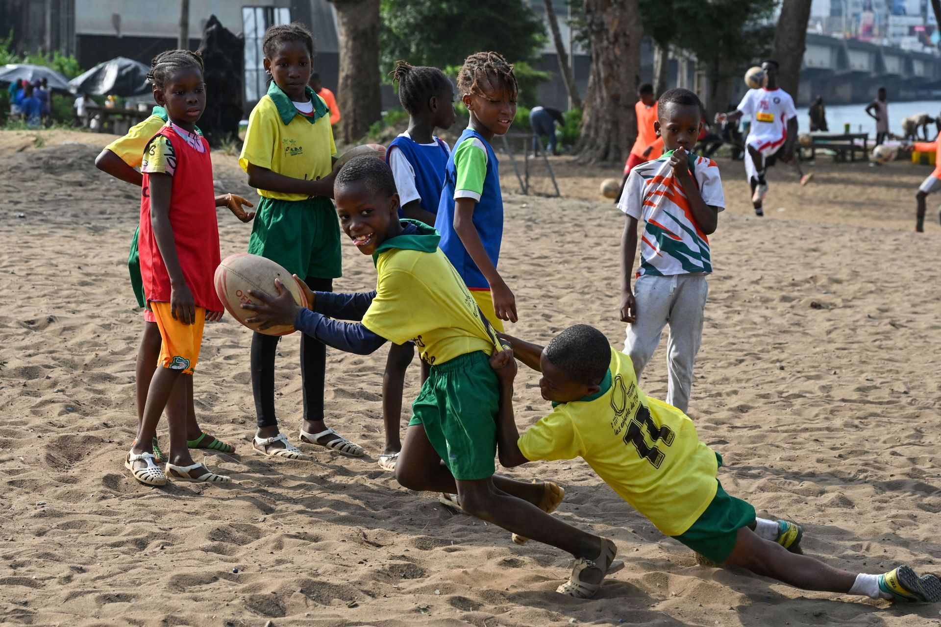 Children play rugby during a training camp with France's Stade Toulousain academy in Abidjan on February 26, 2025. ISSOUF SANOGO / AFP