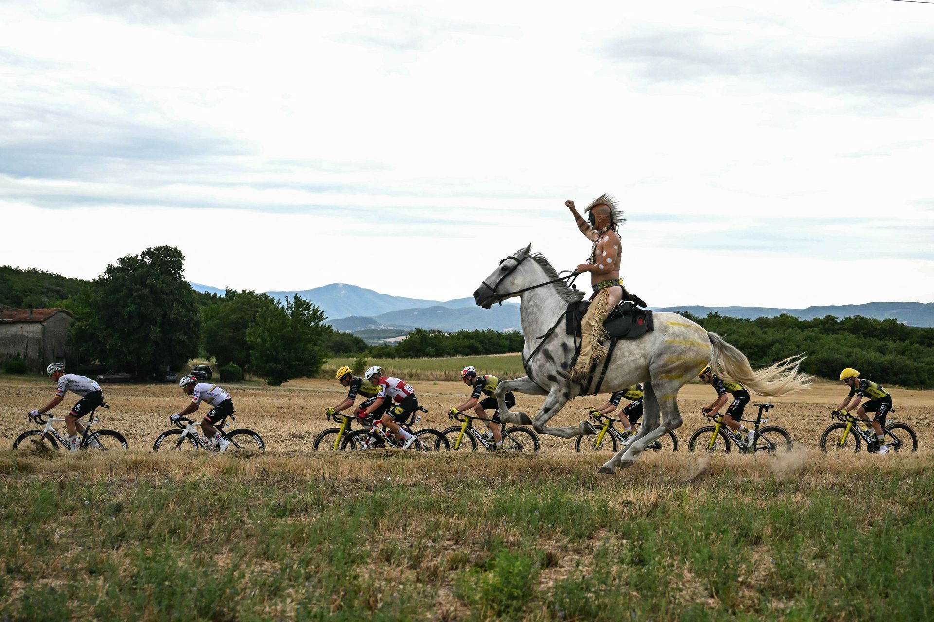 A man on horseback rides alongside the pack of riders (peloton) during the 17th stage of the 112th edition of the Tour de France cycling race, 160.4 km between Bollène and Valence, southern France, on July 23, 2025. LOIC VENANCE / AFP