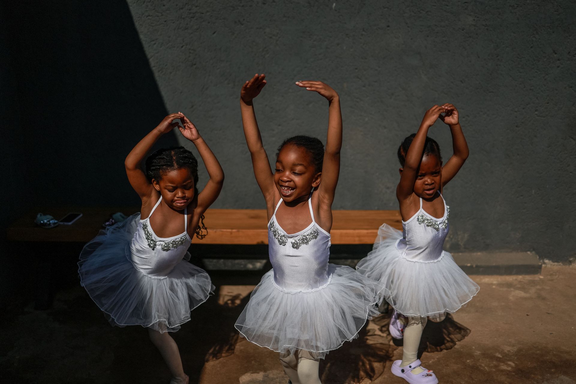 Young ballet students (4-6 years) at Mballet Dance Academy dance outside the studio before starting their lesson in Tembisa on July 26, 2025. Mballet Dance Academy is a small, deeply rooted dance academy in Winnie Mandela's section of Tembisa township, created not just to teach ballet but to open doors in a community where resources are few and dreams often feel out of reach. PHILL MAGAKOE / AFP
