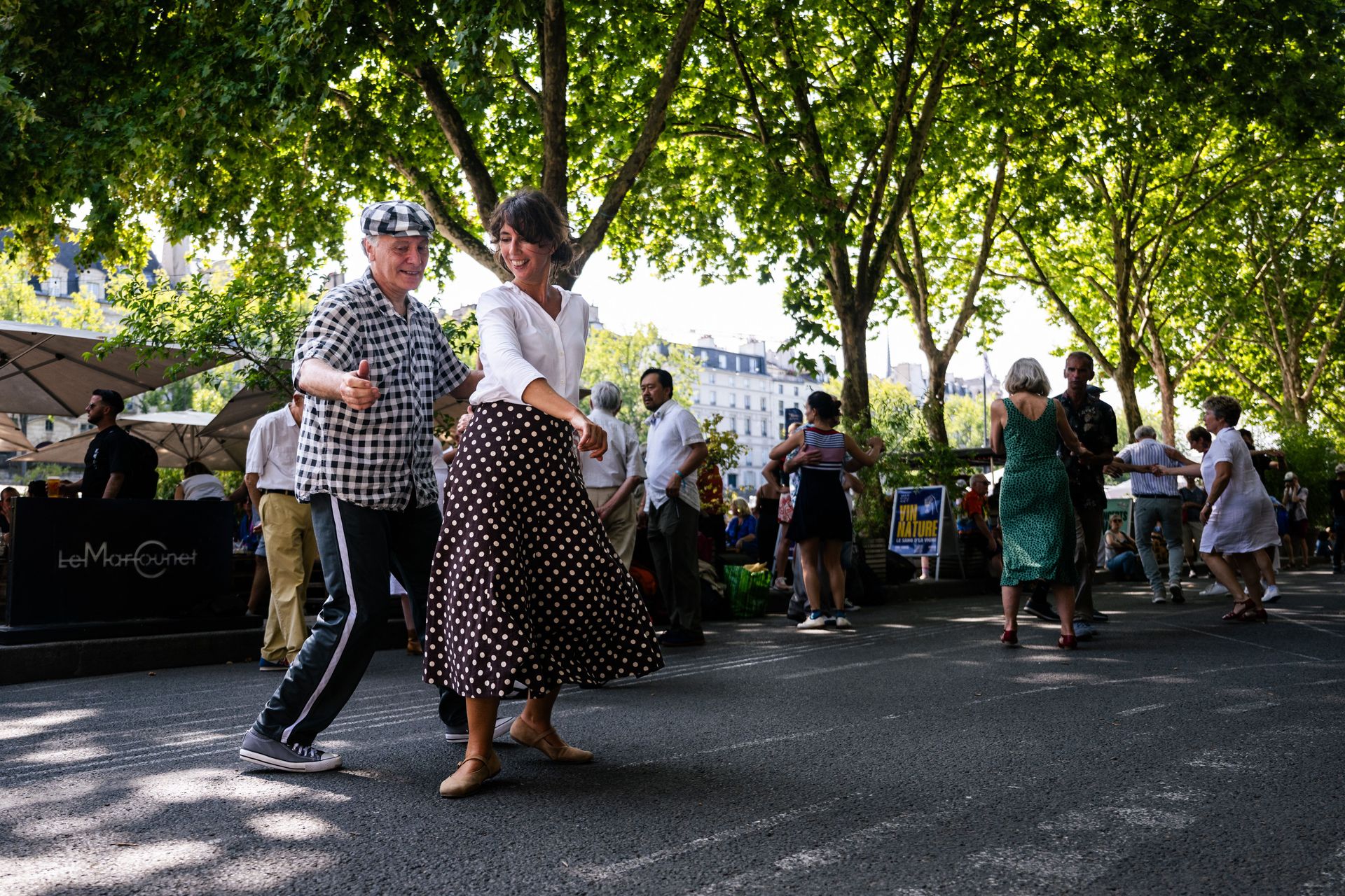 People dance to music playing on the Quai de l'Hôtel de Ville along the River Seine in Paris on August 10, 2025. JULIE SEBADELHA / AFP
