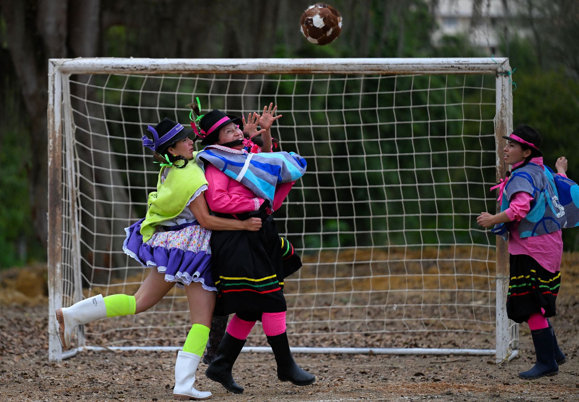Players of Rubas (in blue) and Jenesano (in green) fight for the ball in a football tournament during the Botas, Ruana and Sombrero cultural and sport festival in Jenesano, Boyacá department, Colombia, on August 18, 2025. Eight women’s teams made up of residents and farmers from Jenesano, a rural village in the mountains of Colombia, participate every year in the amateur football tournament called "Botas, Ruana y Sombrero" (Boots, ruana and hat), in which they play wearing traditional clothing. LUIS ACOSTA / AFP